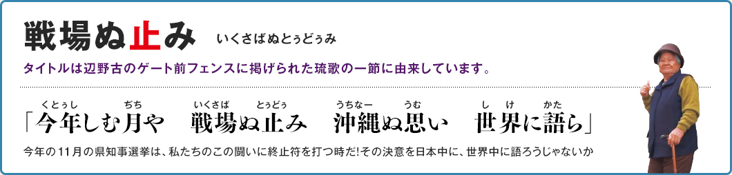 本作で三上智恵監督(『標的の村』「海にすわる~辺野古600日の闘い~」)が描くのは激しい対立だけではない。基地と折り合って生きざるをえなかった地域の人々の思いと来し方。苦難の歴史のなかでも大切に育まれた豊かな文化や暮らし。厳しい闘争の最中でも絶えることのない歌とユーモア。いくさに翻弄され続けた70年に終止符を打ちたいという沖縄の切なる願いを今、世界に問う。