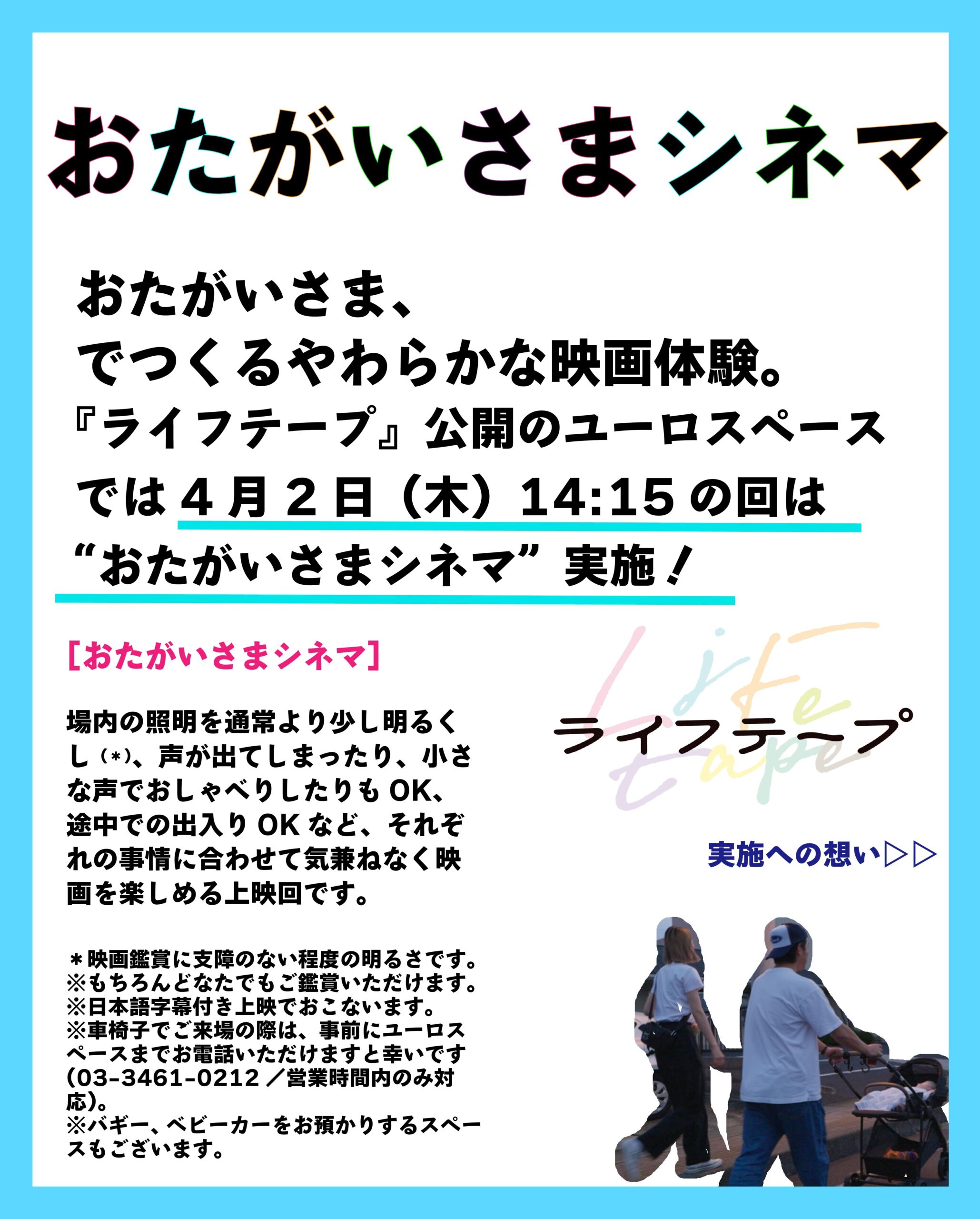 3月28日(土)よりユーロスペースを皮切りに公開する映画『ライフテープ』では隆一さん、朱香さん、珀久くんが、たくさん散歩して、お出かけする姿がとっても印象的です。でも小さなお子さんと一緒にでかけるのは、特に映画館となると大変だったり、