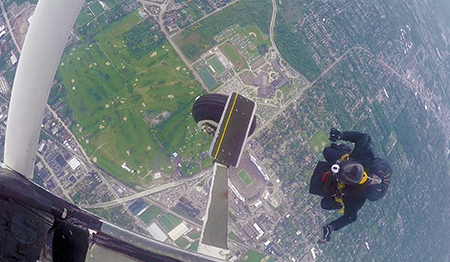 次に軍隊の影。『ザ・ビッグハウス』はスタジアム上空からの海軍特殊部隊ネイビーSEALS隊員のパラシュート降下で始まる。SEALSは敵地の奥深くに侵入する命知らずの精鋭たち。アナウンサーは「彼こそ本当の英雄です」と讃える。地方の大学のフットボールと軍隊のつながりは論理的には説明されない。